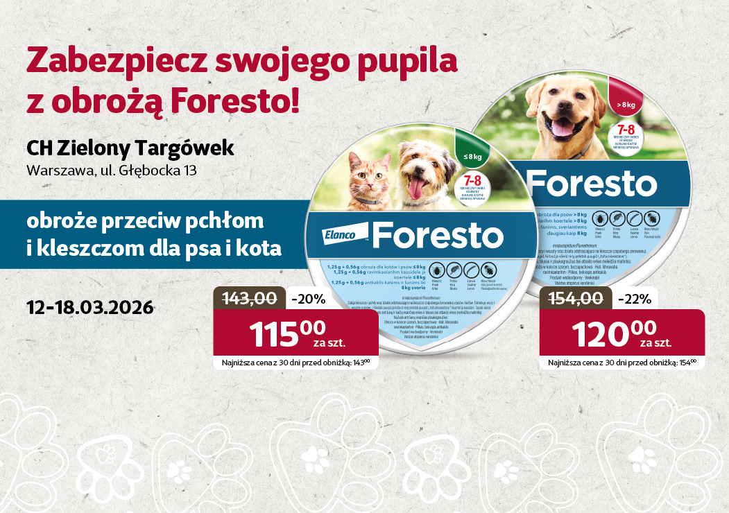 UWAGA WSZYSCY POSIADACZE KARTY KAKADU ZOO FAMILY! 🌿Owadobójcza obroża Foresto w specjalnej klubowej cenie!Nie czekaj – zapewnij swojemu psu lub kotu skuteczną ochronę przed kleszczami i pchłami aż do 8...