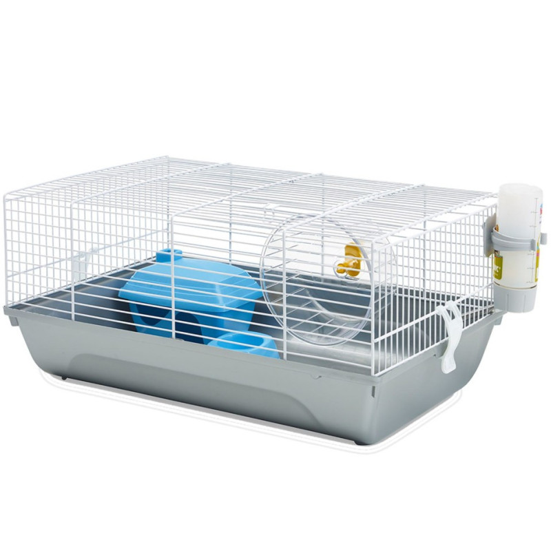 To wszechstronna klatka, z górą wykonana z niebieskich, metalowych pręcików i plastikową, różową kuwetą. To klatka z pełnym wyposażeniem, posiadająca koło, domek, miseczkę i poidełko.