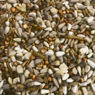 To połączenie drobnych ziaren, łuskanego słonecznika, orzeszków ciętych w kostkę oraz suszonych larw mącznika młynarka.